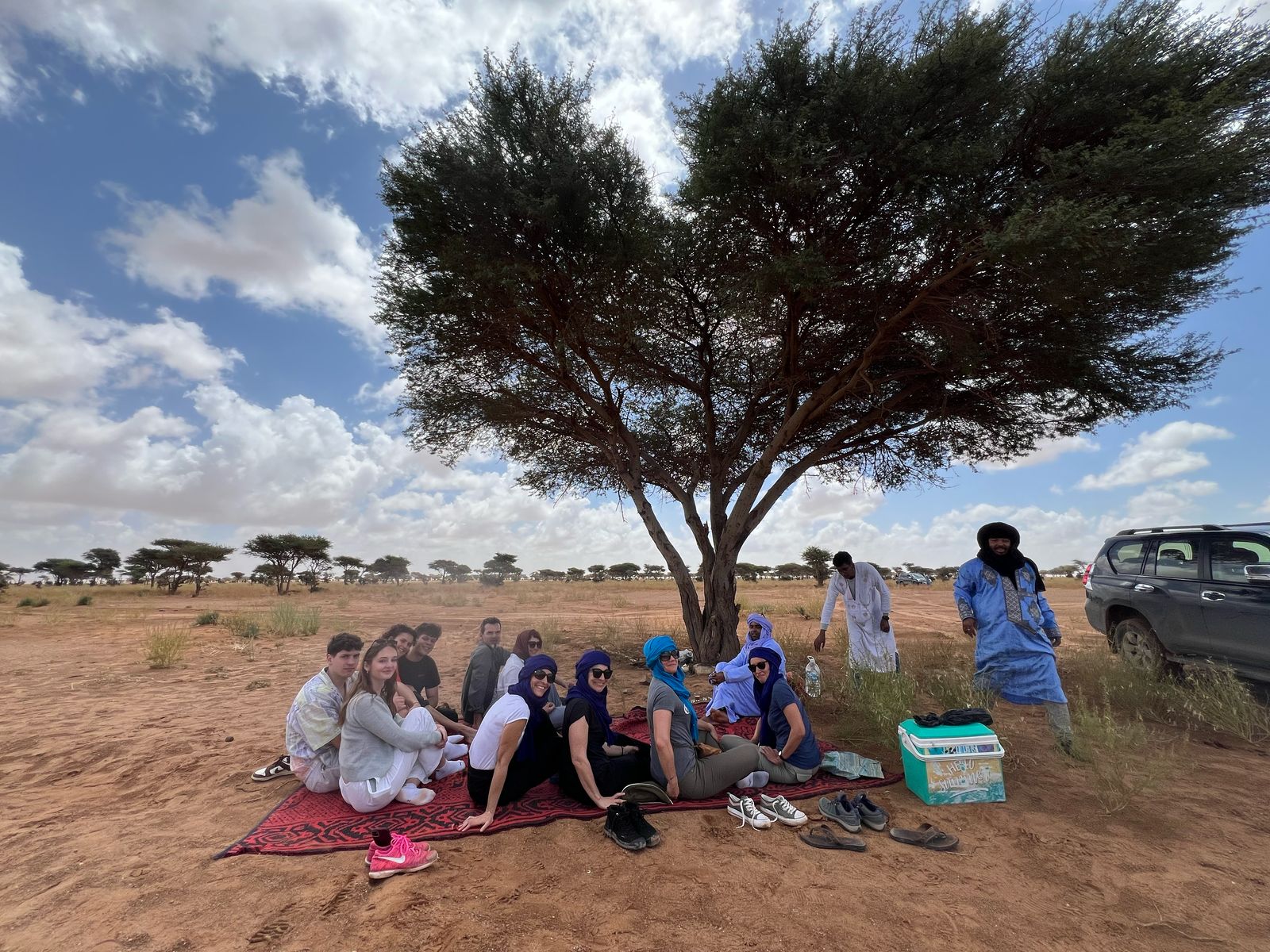 • Off-road journey across the desert, passing rocky plateaus, dunes, and tamarisk trees.